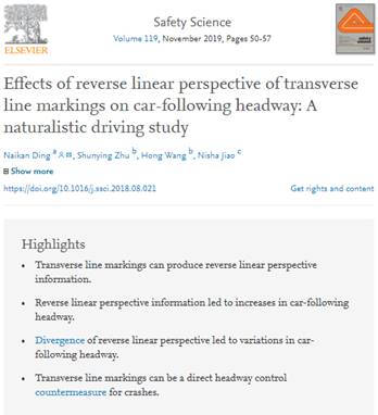(通讯员:交通研究中心)近日,我院丁乃侃老师在安全领域国际主流期刊Safety Science上,以第一及通讯作者身份发表了最新研究成果《Effects of reverse linearperspective of transverse line markings on car-following headway: Anaturalistic driving study》(DOI: 10.1016/j.ssci.2018.08.021,JCR 1区,IF=3.619)。