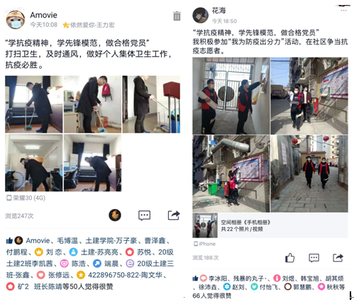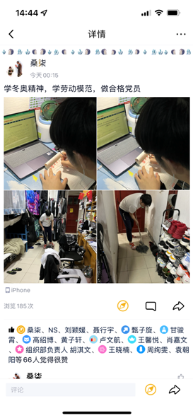 进社区争当防疫志愿者、打扫宿舍集体区域卫生、清扫教学楼教室卫生、清理宿舍区域小广告、整理学校摆放无序影响校园环境的自行车、帮助食堂阿姨回收餐盘、帮物业阿姨清扫校园落叶……等等一件件力所能及的小事,聚少成多,聚沙成塔,形成集群效应,同时大家将自己的劳动行为广发朋友圈,积极带动身边其他同学一起参与,营造“劳动光荣,全员防疫”的良好节日氛围,向武昌校区展示了土建学院学生党员的青春担当。