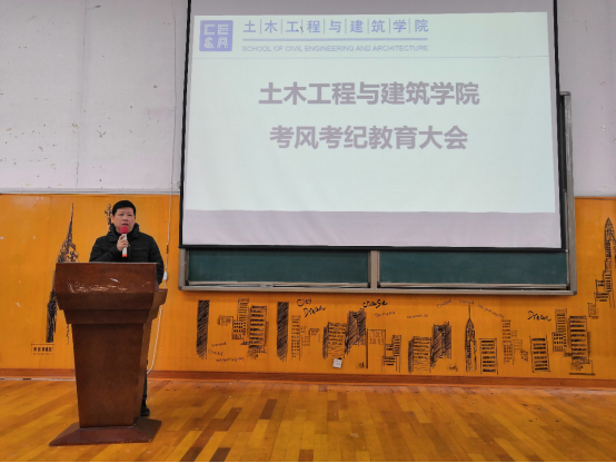 1月8日中午,土木工程与建筑学院期末考风考纪教育大会在武昌校区2430教室召开。本次会议由辅导员肖豪主持,参加此次会议的有土建学院辅导员梁春晴和项勤老师,学院党委副书记郭飞以及2017、2018级全体同学。