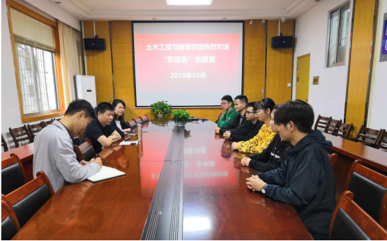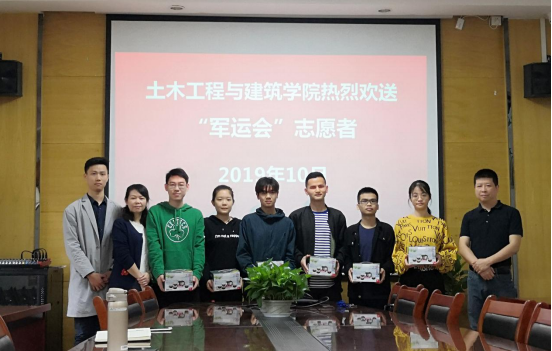 (通讯员肖豪)2019年10月14日上午,土木工程与建筑学院在学院会议室为六名参加第七届“世界军人运动会”服务与保障工作的志愿者举行了简短热烈的欢送仪式。学院党委副书记郭飞、学工办辅导员肖豪、教学办陈萍老师参加了此次欢送会。