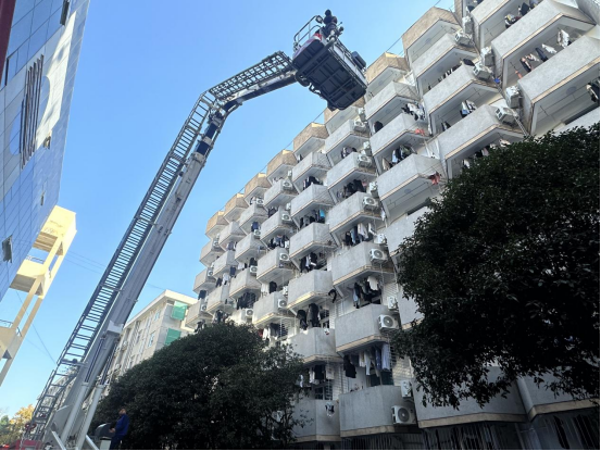 在模拟救援环节,被困同学没有盲目闯过高温火场,而是站在阳台通风位置呼救等待救援,消防云梯车设有伸缩式云梯,带有升降斗转台及灭火装置,面临火灾危险时刻,消防人员使用云梯登高,通对阳台对被困人员进行营救。