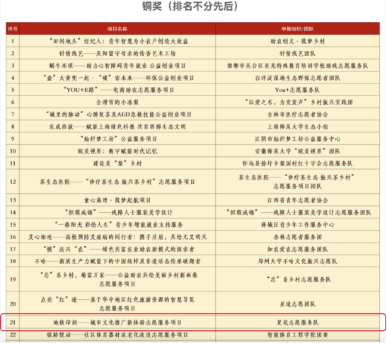 (通讯员:冯豪)在第39个国际志愿者日来临之际,11月30日至12月1日,第七届中国青年志愿服务公益创业赛全国赛终评在广东汕头举办,来自武汉工程大学土木工程与建筑学院的“地铁印刻—城市文化推广新体验志愿服务项目”在赛事中获得铜奖。