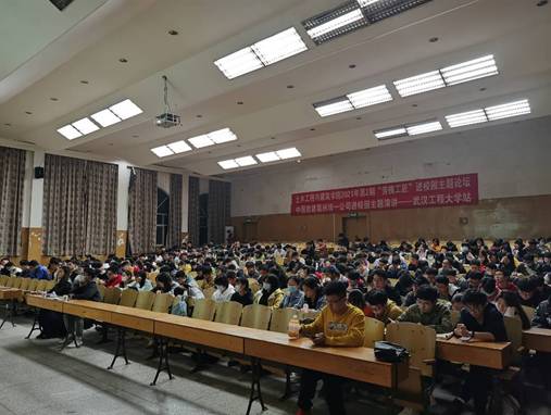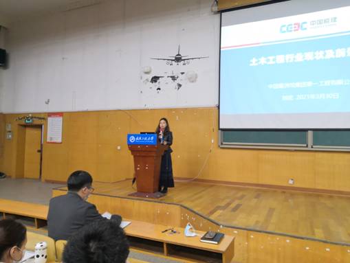 刘武总经理以武汉工程大学300余名毕业生学长学姐在中国能建葛洲坝集团和第一工程有限公司贡献自己的青春力量为切入点,向同学们传达了武汉工程大学土建学院毕业生大有可为的理念。随后结合自己多年一线工作的经历和生动的工程案例,从水利水电工程、建筑工程、公路与城市道路工程、市政工程、机场工程和水务环保工程等六个方面系统全面介绍了土木工程行业现状及前景分析,并就专业知识学习、行业选择、就业方向和创业等方面给予中肯建议。