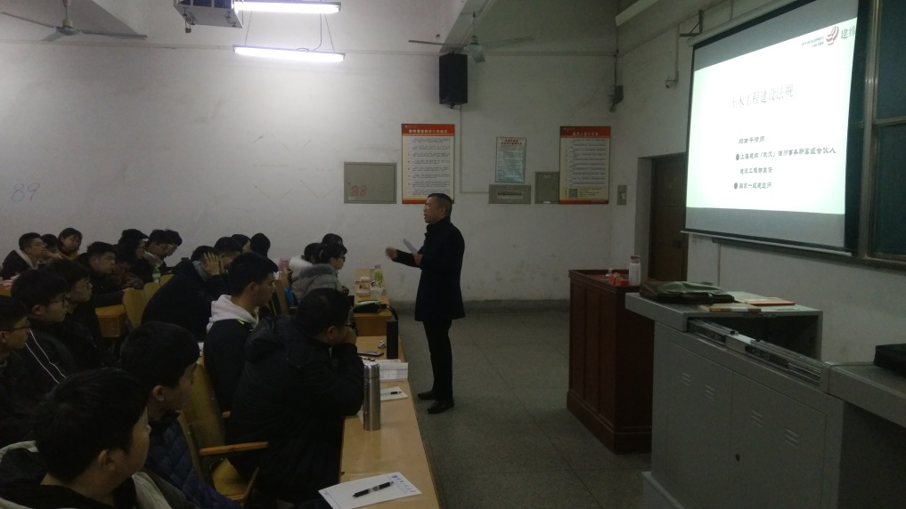 (通讯员朱志刚)2月26日上午,为响应工程教育认证的要求,应土木工程与建筑学院和土木工程系邀请,上海建纬(武汉)律师事务所高级合伙人,建设工程部主任邓南平律师莅临我校,为我校土木工程专业学生讲授《建筑法规》课程第一课。讲学由土木工程系系主任吴巧云副教授主持,学院相关教师和16级土木工程专业全体学生认真聆听了邓律师的授课。