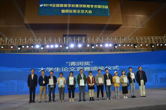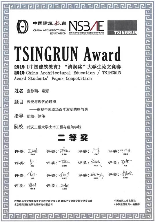 (通讯员:彭然)2019年10月18~20日,在由教育部高等学校建筑学专业教学指导委员会主办、成都市西南交通大学承办的2019全国高等学校建筑教育学术研讨会暨院长系主任大会上,2019年“清润奖”大学生论文竞赛结果正式揭晓并颁奖,我校土木工程与建筑学院建筑学专业2017级本科生童徐颖和秦源的参赛论文《传统与现代的碰撞——审视中国剧场百年演变的得与失》在本科组的全国116篇参赛作品中排名第4,荣获二等奖,指导老师为彭然和徐伟。
