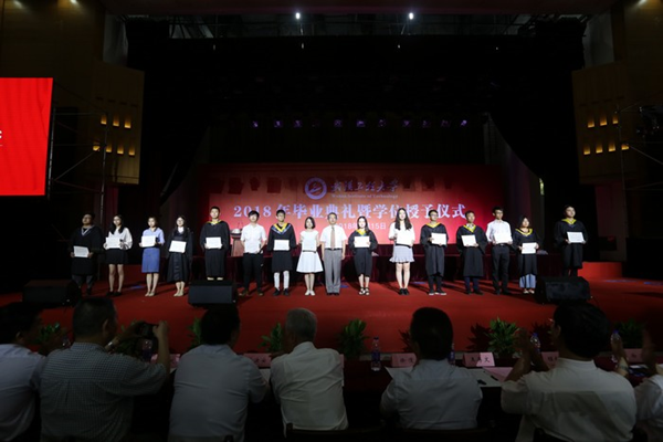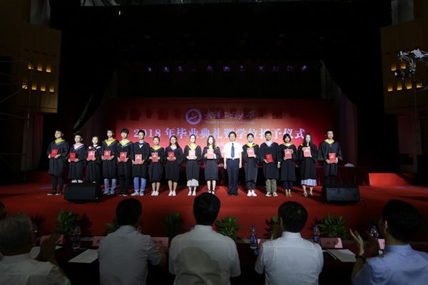 2018届毕业生在校期间,秉承“格物明理,致知笃行”的校训,刻苦学习,积极进取,涌现了一大批思想积极上进、学习成绩优异、专业素质过硬、身心健康发展的优秀个人。副校长张彦铎为优秀毕业生代表颁发荣誉证书,四级职员喻九阳宣读《武汉工程大学2018年优秀毕业生表彰决定》。