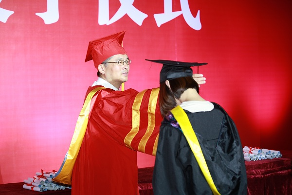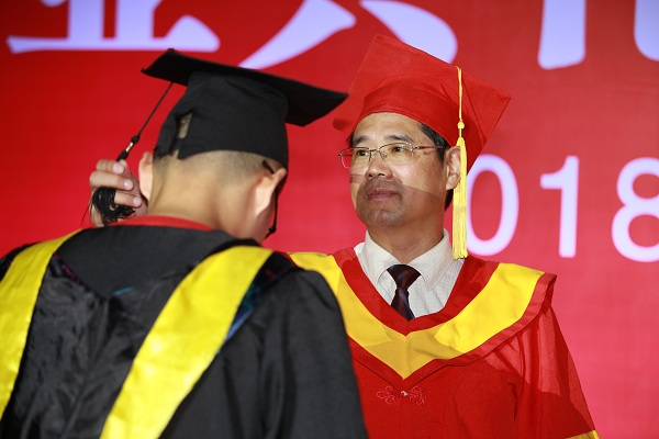 校学位评定委员会主席校长王存文教授宣读《武汉工程大学2018届毕业生学位授予文件》。授位导师为在场每一位获学位的毕业生行拨穗礼。