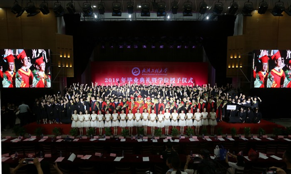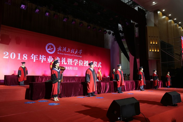 上午9时,武汉工程大学2018年毕业典礼暨学位授予仪式在雄壮的国歌声中拉开帷幕。校党委书记程幼金、校长王存文、校纪委书记徐慢、副校长张彦铎、陈再平、陆培祥、四级职员喻九阳,校长助理池汝安出席了典礼。学位委员会成员、各学院领导、职能部门负责人、教师代表、家长代表、全体毕业生辅导员、班主任和2018届全体毕业生参加典礼。