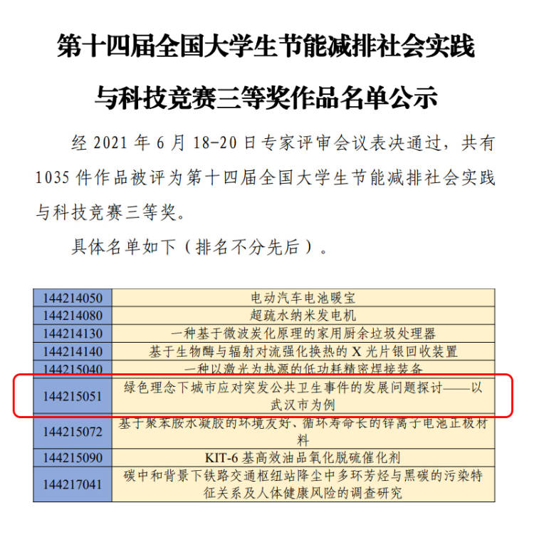 (通讯员刘斐旸)近日,第十四届全国大学生节能减排社会实践与科技竞赛落下帷幕。由土建学院推选的参赛作品《绿色理念下城市应对突发公共卫生事件的发展问题探讨——以武汉市为例》,荣获全国大赛三等奖。该作品在彭然、彭玉玲两位老师的指导下,由刘斐旸、于翰文、陈蔚三位同学共同完成。