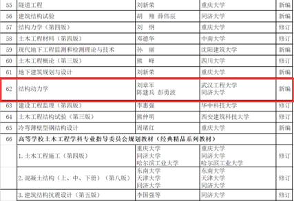 (通讯员 周小龙)近日,住房和城乡建设部公布了“十四五”规划教材立项建设名单,由我校土木工程与建筑学院刘章军教授和同济大学陈建兵、彭勇波教授主编的《结构动力学》研究生教材在全国高等教育、高等职业教育和中等职业教育的住房和城乡建设领域512项学科专业规划教材中脱颖而出,入选高等教育类教材立项建设名单。
