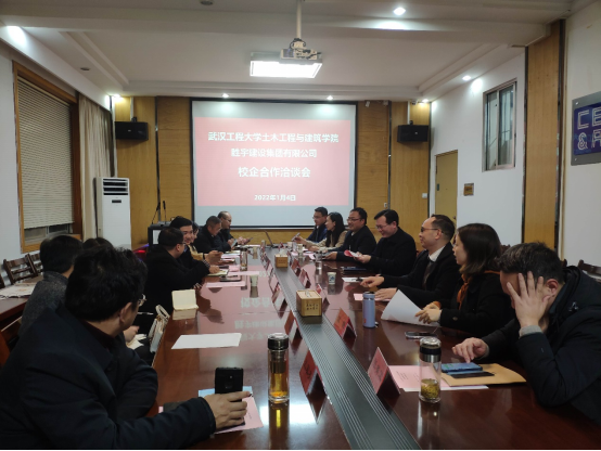 (通讯员杜智)2022年1月4日下午,在武昌校区土木工程与建筑学院会议室,武汉工程大学党委常委、科学技术发展院院长吴云韬、土木工程与建筑学院党委书记陆新、院长陈旭勇接待了来校访问交流的武穴市人民政府副市长田琦峰、胜宇建设集团有限公司董事长张学义等一行八人,校企双方就如何加强校企合作,充分利用双方优势,提高高校服务社会服务地方经济建设能力,加快企业专业紧缺人才培养,达到校企双赢等问题进行了广泛交流和洽谈,双方初步达成了合作共识。参加交流座谈的有科学技术发展院副院长季家友,副院长吴巧云、院长助理边晓亚、工会主席张哨军等。座谈会由土木工程与建筑学院党委副书记成轶主持。