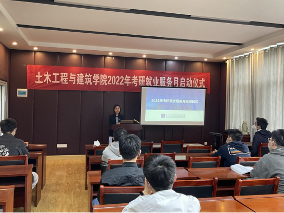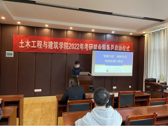 (通讯员 曾学菲)2022年4月14日下午,学院在智慧学习中心411报告厅举行土木工程与建筑学院2022年“考研就业服务月”启动仪式暨“朋辈引航”考研就业故事分享会,学院党委副书记成轶,2018级、2019级城市与地下空间工程专业本科生参与活动,活动由学工办主任曾学菲主持。