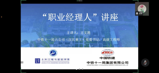 (通讯员曾学菲)2022年5月20日晚,由学校招生与就业工作处主办,土木工程与建筑学院承办的职业经理人行业讲座在武昌校区W2202教室、学院阅览室和腾讯会议线上同步进行。中铁十一局第六公司(汉江重工)党委书记、高级工程师王文胜受邀作报告。