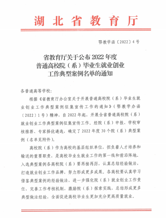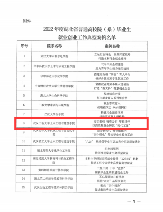(通讯员:张中强)近日,湖北省教育厅公布了2022年度普通高校院(系)毕业生就业创业工作典型案例遴选结果,武汉工程大学土木工程与建筑学院就业工作案例《夯实基础 精准分析 厚植情怀 以高质量就业铸就“时代工匠”》经过学校审核推荐、专家择优遴选,最终脱颖而出,成功获评湖北省普通高校院(系)毕业生就业创业工作首批典型案例。