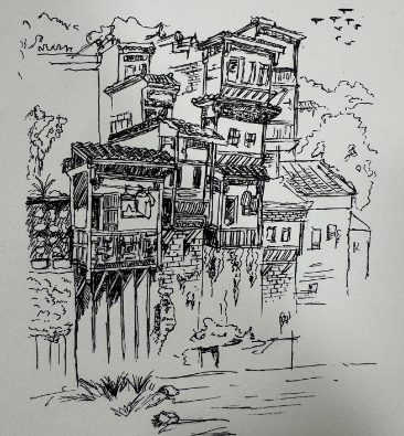 置身于古建筑之中,实践队队员拿起画笔,结合专业特点展开创作并进行展示。