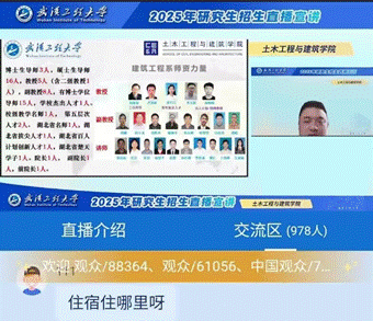 与此同时,线上宣讲活动也同步展开,通过网络直播面向全国学子。彭然、谢莎莎、万九鸣、王慧妮等老师参与了此次线上宣讲,他们围绕学校的校园环境、学院的学科研究方向和学术资源等展开介绍,并结合当前考研趋势,详细讲解了报考流程、复习策略、导师选择等实用信息。直播中,师生互动热烈,讲师们耐心解答了学生的疑问,进一步增强了大家的备考信心,加深了广大青年学子们对武汉工程大学及土木工程与建筑学院的了解。
